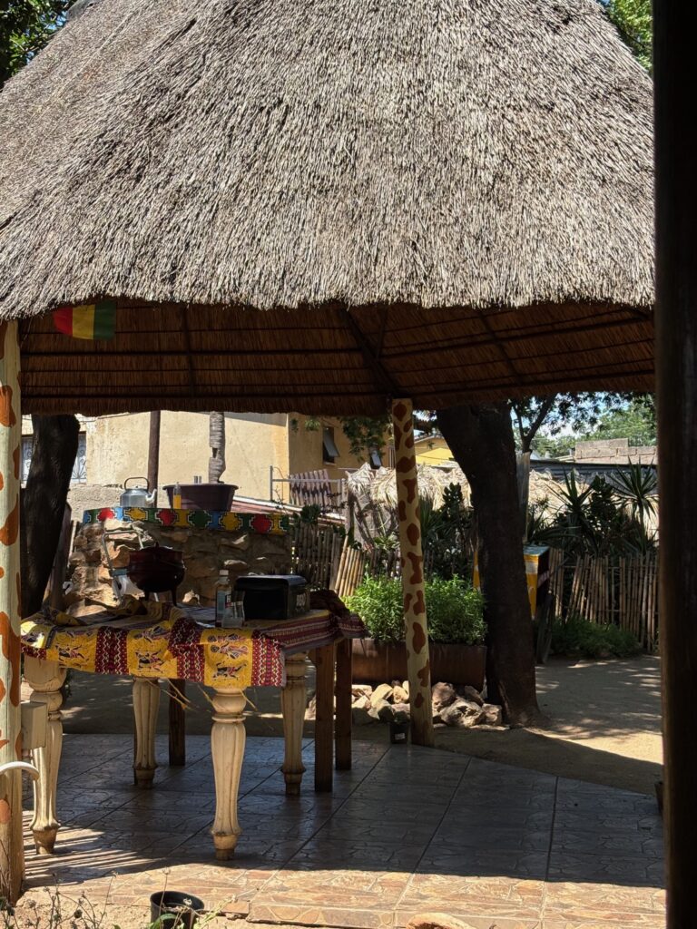 Es ist kein klassisches Restaurant, sondern ein Braai – das südafrikanische Barbecue, sozialer Mittelpunkt jeder Zusammenkunft. Eine Liveband spielt afrikanischen Pop, Stimmen mischen sich mit dem Klirren von Geschirr. Das Essen ist würzig, kräftig, genau das Richtige nach einem Flug, der eher Durchhalteübung als Komfort war. Nichts wirkt inszeniert. Alles fühlt sich echt und aufregend an.