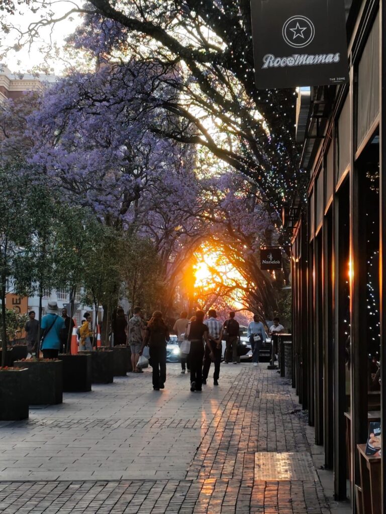 Entlang der Straßen stehen Jacaranda-Bäume in voller Blüte. Ursprünglich aus Südamerika eingeführt, blühen sie im südafrikanischen Frühling (Oktober-November) in intensivem Lila. Wunderschön – und wegen ihres hohen Wasserverbrauchs nicht unumstritten in dieser trockenen Region. Trotzdem prägen sie das Stadtbild vieler Viertel und verleihen Johannesburg eine fast surreale Farbkulisse.